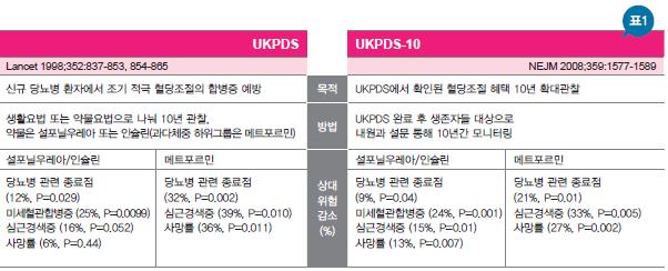 그런데 이 연구가 종료된 후 또 다시 10년을 연장해 확대관찰을 실시한 결과(UKPDS-10), 시험군과 대조군의 당화혈색소(A1C) 차이가 소실된 후에도 미세혈관 합병증 감소효과가 유지되는 것은 물론 심혈관 합병증(대혈관 합병증) 역시 유의한 감소로 귀결됐다<표 1>. 이를 두고 학계에서는 초기에 적극적으로 혈당을 조절하는 것이 장기적인 합병증 혜택에 유리한 고지를 선점하는 것이라며, 초기 혈당조절의 중요성을 강조하는 동시에 레거시 효과 개념을 적용했다.