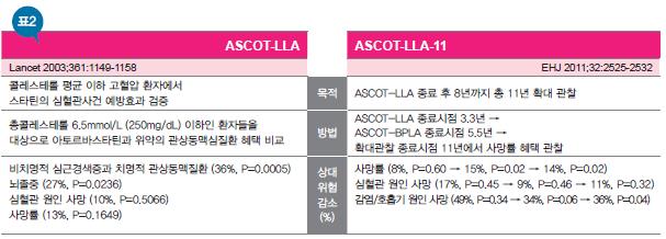 ASCOT-LLA 연구의 11년 관찰결과를 이해하기 위해서는 배경설명이 필요하다. ASCOT-LLA 연구는 항고혈압제 요법의 심혈관 임상혜택을 검증키 위한 ASCOT-BPLA에서 기저시점의 총 콜레스테롤 수치가 6.5mmol/L(250mg/dL) 이하인 환자들을 대상으로 아토르바스타틴과 위약을 비교했다. 총 1만 9342명이 ASCOT-BPLA를 위해 칼슘길항제 + 이뇨제 또는 칼슘길항제 + 안지오텐신전환효소억제제(ACEI)군으로 배정됐으며, 이 가운데 1만 305명이 아토르바스타틴(10mg) 또는 위약군으로 치료를 받았다.