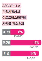 더불어 ASCOT-LLA 종료시점에서 통계적으로 유의하지 않았던 사망률의 차이(13%)까지도 확대관찰에서는 15% 유의한 감소로 귀결됐다. 3.3년과 5.5년의 아웃컴(심혈관사건) 관찰결과는 1·2차 종료점 거의 모두에서 큰 차이가 없었다.