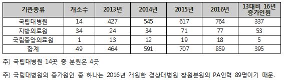 이들 병원에서 운영하고 있는 PA는 2016년 현재 859명. 이는 2013년 464명에 비해 2배 이상 늘어난 수치다.