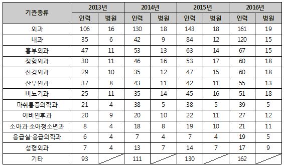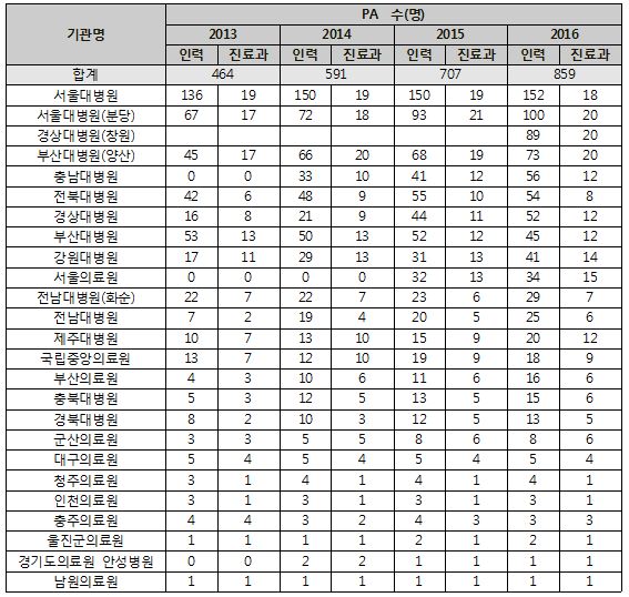 2016년 기준 PA인력이 가장 많은 병원은 서울대병원으로 18개 진료과에서 152명의 인력을 운영하고 있었다. 분당서울대병원(100명), 창원경상대병원(89명), 양산부산대병원(73명)도 PA 인력이 많았다.