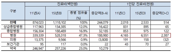 특히 병원급 의료기관의 진료비 증가율이 두드러졌는데, 2011년 3393억원에서 2015년 5283억원으로 1890억원(55.7%) 급증했다.