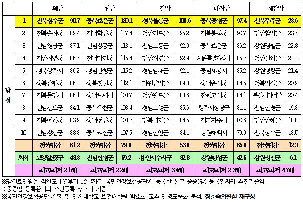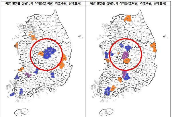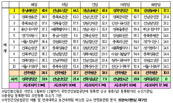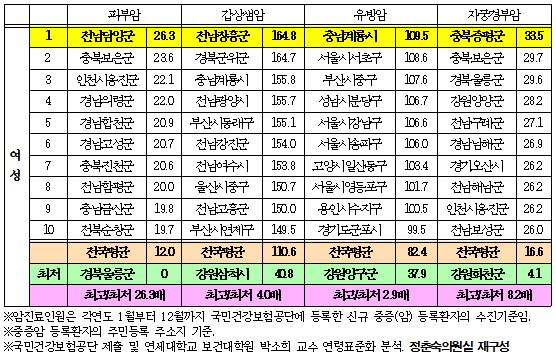 구체적으로는 △폐암은 충남 태안군이 10만명당 40.9명(전국평균 26.5명)으로 전국에서 여성 폐암 발생률이 가장 높았으며 △위암은 전남 보성군이 10만명당 64.1명(전국평균 37.7명) △간암은 경남 남해군이 10만명당 41.8명(전국평균 18.5명) △대장암은 경북 영양군이 10만명당 706명(전국평균 42.8명) △췌장암은 강원 동해시가 10만명당 17.1명(전국평균 10.3명)으로 전국에서 발생률이 가장 높았다.