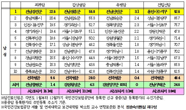이를 시군구별로 분석한 결과, 남성은 암유형과 지역에 따라 암발생률의 차이가 폐암은 2.1배, 위암은 2.2배, 간암은 3.4배, 대장암은 2.3배, 췌장암은 4.7배, 피부암은 16.1배, 갑상샘암은 13.2배, 유방암은 3.1배, 전립선암은 3.8배나 나는 것으로 나타났다.