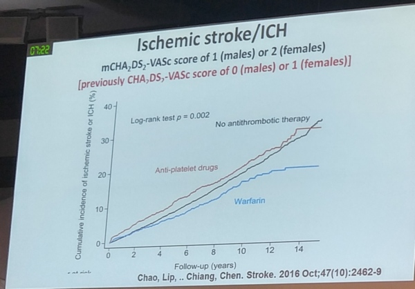 그는 우선 "CHA₂DS₂-VASc 점수가 같아도 아시아에서 뇌졸중 위험도가 높다"고 강조했다. Chiang 교수는 스웨덴, 대만, 홍콩의 심방세동 환자의 뇌졸중 위험도를 평가한 연구들을 비교했다. CHA₂DS₂-VASc 점수에 따른 뇌졸중 위험도를 비교한 결과 0점에서 뇌졸중 위험은 스웨덴 0.2%, 대만 1.1%, 홍콩 2.4%였고, 1점에서 각각 0.6%, 1.7%, 6.6%, 2점에서 2.2%, 3.2%, 7.8%, 3점에서 3.2%, 4.2%, 9.6%, 4점에서 4.8%, 5.8%, 11.6%, 5점에서 7.2%, 6.6%, 12.7%로 나타났다. 즉 중증도가 높을수록 아시아인에서 뇌졸중 위험이 더 컸다는 것.