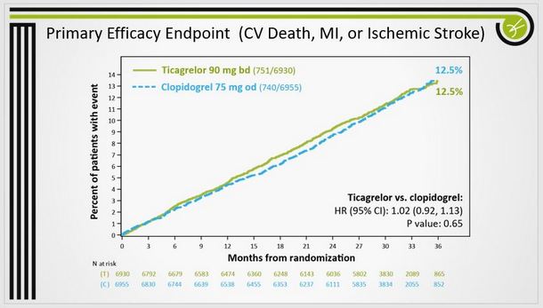 대상환자들은 티카그렐러 90mg군(1일 2회)과 클로피도그렐 75mg군(1일 1회)으로 무작위 분류됐다. 이후 36개월 시점 1차 종료점 발생률은 티카그렐러군과 클로피도그렐군 각각 12.5%로 동일한 수준이었고, 클로피도그렐 대비 티카그렐러군의 위험도는 유의한 차이가 없었다(HR 1.02, 95% CI, 0.92-1.13, P=0.65).