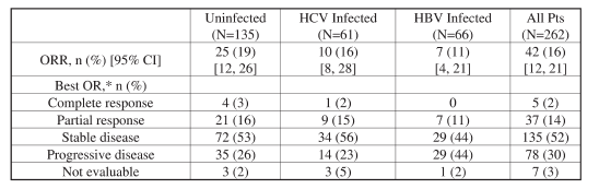 또한 세부군으로 나눴을 경우, 비감염자군, 만성 C형간염군(61명), 만성 B형간염군(66명)의 ORR은 각각 19%(25/135명), 16%(10/61명), 11%(7/66명)로 관찰됐다.