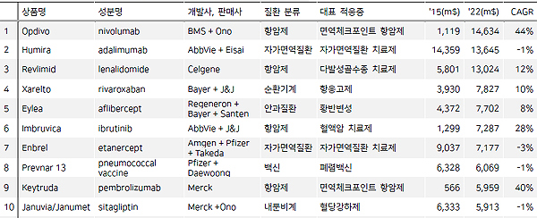 글로벌 제약산업 시장조사기관인 이밸류에이트파마는 BMS와 오노약품공업의 면역항암제 옵디보가 작년 11억1900만달러보다 44%증가한 146억3400만달러치 판매, 2022년 매출 1위에 오를 것으로 내다봤다.