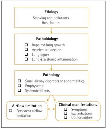 하지만 2017년 가이드라인에서는 COPD를 병인학(etiology), 병리생리학(pathobiology), 병리학(pathology)으로 특성을 정리했고 기류제한과 함께 임상적 징후에도 무게를 뒀다. 병인학에서는 흡연, 공기오염, 환자 관련 인자를 주요한 원인으로 꼽았고, 병리생리학적 특징으로는 폐성장장애, 과도한 폐기능감소, 폐손상, 폐 및 전신성 염증을 꼽았으며, 병리학적측면에서는 소기도장애 및 이상, 폐기종, 전신성 영향을 제시했다. 이들을 배경으로 기류제한과 임상적 징후가 나타난다고 강조했는데 기류제한은 지속적인 양상에 무게를 뒀고, 임상적 징후로는 호흡기증상, 악화, 동반질환을 꼽았다.