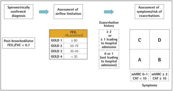 그렇지만 실질적인 진단의 패스웨이(pathway)에서는 증상과 위험인자를 각기 판별하고, 필요할 경우 폐기능검사를 시행하도록 했다. 기류제한은 FEV1/FVC 0.70 미만인 환자에서 FEV1 범위로 구분한 GOLD 기준을 유지했고, 증상 평가 역시 이전 가이드라인에서 권고하고 있는 mMRC(modified British Medical Research)와 CAT(COPD Assessment Test)를 활용하도록 했다.