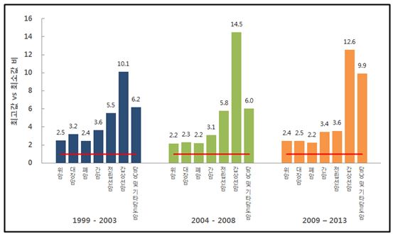 암종별로 지역별 특이점을 살펴보면, 갑상선암은 전남, 대장암은 대전시·충청도, 폐암은 전남·경북·충북, 유방암 및 전립선암은 서울 강남·서초 및 경기 성남 분당에서 높게 나타났다.