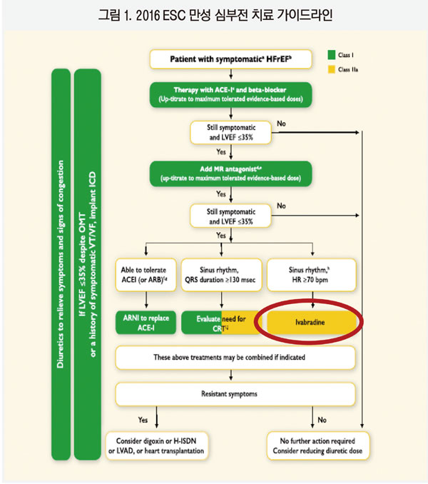 2016 ESC 가이드라인에서 또 달라진 점은 ACEi+베타차단제+MRA 병용요법 시 증상이 완화되지 않으면 ACEi 대신 안지오텐신 수용체 네프릴리신 억제제(angiotensin receptor neprilysin inhibitor, ARNI)를 교체 투여하고, 증상이 완화되지 않고 심박수가 분당 70회 이상인 경우에는 ivabradine을 추가하도록 권고한 것이다<그림 1>.
