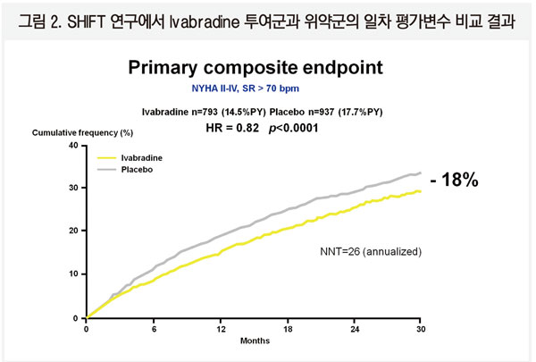 또한, ivabradine 투여량을 5 mg으로 시작해 7.5 mg까지 up-titration하여 위약과 심박수 변화를 비교한 결과, ivabradine은 위약 대비 심박수를 분당 11회 감소시켰고 일차 종합 평가변수인 심혈관질환으로 인한 사망과 심부전으로 인한 입원의 상대위험도를 위약 대비 18%나 유의하게 감소시켰다(p<0.0001)<그림 2>.