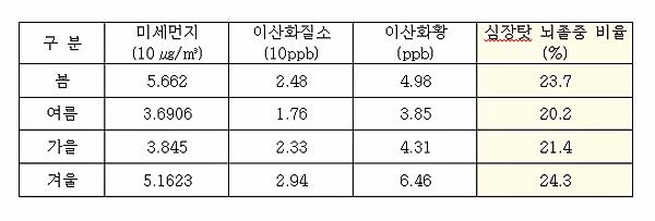 미세먼지와 이산화황 농도가 높은 겨울(24.3%)과 봄(23.7%)의 경우 다른 계절에 비해 심장탓 뇌졸중이 전체 뇌졸중에서 차지하는 비율이 상대적으로 높았다.