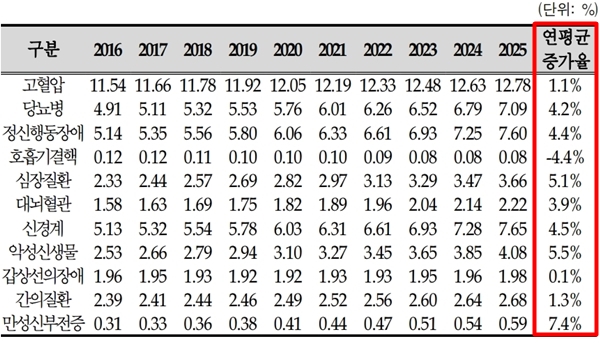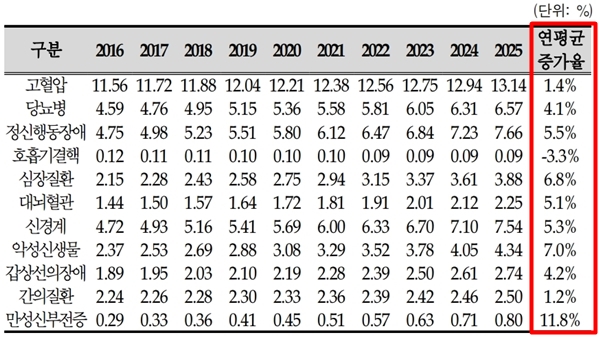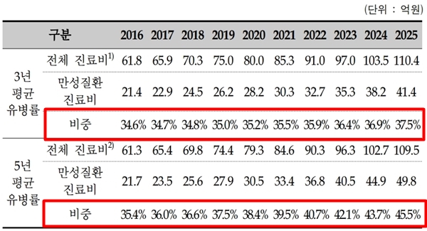 그 결과, 과거 3년 평균 유병률을 기준으로 할 때 만성질환 진료비는 2016년 21조 4000억원에서 2025년 41조 4000억원으로 증가했다.