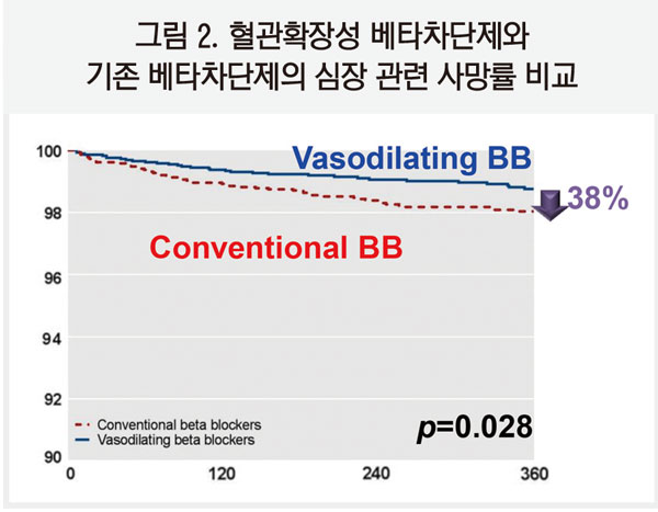 2011년 11월부터 2015년 11월까지 KAMIR에 등록된 환자 중 PCI를 받은 AMI 환자 7,127명을 대상으로 연구를 진행했다. 혈관확장성 베타차단제군은 3,482명, 기존 베타차단제군은 3,645명이었고 carvedilol 44.9%, nebivolol 4.0%, bisoprolol 49.3%, metoprolol 1.8%의 사용 비율을 나타냈다. 결국 carvedilol과 bisoprolol의 직접(direct) 비교라고 볼 수 있으며 연구 결과 혈관확장성 베타차단제군은 기존 베타차단제군 대비 심장 관련 사망 위험이 38% 감소했고(p=0.028)<그림 2>, 심장 관련 사망과 MI 재발 및 혈관재개통술의 복합 발생률은 24% 감소했다(p=0.026).