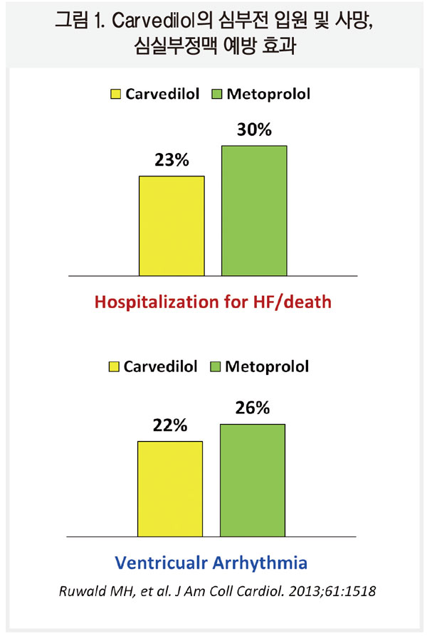 Multicenter Automatic Defibrillator Implantation Trial With Cardiac Resynchronization Therapy (MADIT-CRT)는 좌심실부전(좌심실박출량 ≤ 30%) 및 QRS 간격 ≥ 130 ms를 보이는 1,820명의 환자를 carvedilol군과 metoprolol군으로 무작위 배정해 심부전으로 인한 입원과 사망, 심실부정맥 발생을 비교했다. 연구 결과 1차 평가항목인 심부전으로 인한 입원과 사망은 carvedilol군에서 metoprolol군 대비 30%의 감소를 보였고(p=0.001), 심실부정맥 역시 carvedilol군이 metoprolol군보다 낮은 발생률을 보였다(HR 0.80, p=0.050, J Am Coll Cardiol. 2013;61:1518)<그림 1>.