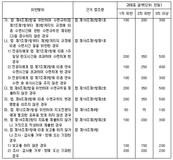 ■수련시간 미준수 등 과태료=시행령에는 법 위반행위에 따른 과태료 부과기준이 구체적으로 명시됐다.
