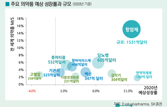 실제 글로벌 의약품 시장에서 가장 큰 규모를 차지하는 분야는 바로 항암제다. 제약산업 분석회사인 이벨류에이트파마는 전 세계 항암제 시장은 2015년 기준으로 832억달러(약 100조원)에서 2020년 1531억달러(약 184조원)로 확대될 것으로 전망했다.