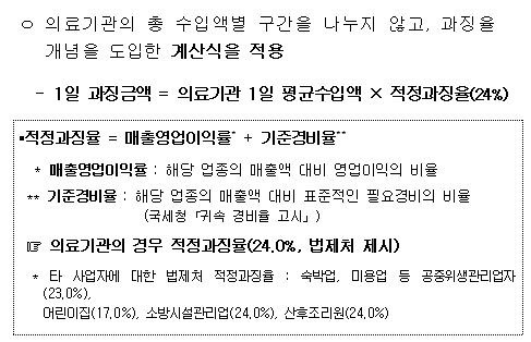 실제 복지부가 지난해 내놓은 개정안(과징율 24%)을 바탕으로 시뮬레이션을 해보면, 연간 수입액이 100억원인 기관의 1일당 과징금은 657만 5300원으로, 영업정지 기간이 8일만 되도 총 과징금 규모가 5000만원 상한선을 넘는다.