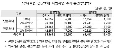 시범사업 기관으로 지정된 전국 65개 한방 병·의원에서 근골격계 질환으로 한방 추나요법을 시술을 받을 경우 건강보험 급여가 적용돼, 단순추나는 4800원~6700원 전문추나는 8100원~1만 7000원만 본인부담하면 된다.