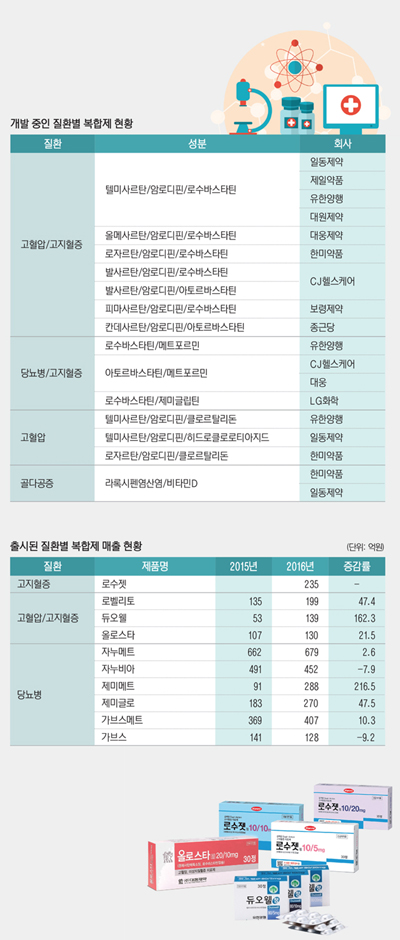 제약업계 관계자는 "단일 약물로 치료 한계가 있는 환자들은 증량하기보다는 병용치료 또는 복합제 처방을 고려하는 것이 추세"라면서 "또한 하나의 심혈관계 질환을 가지고 있는 환자들도 위험인자가 계속 늘어날 가능성이 높아 증상을 개선하는 것은 물론 동시 발현될 위험인자들을 종합적으로 관리하고 차단할 수 있는 복합제가 대세일 수밖에 없다"고 말했다.
