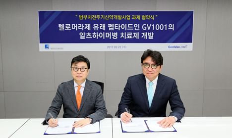 젬백스앤카엘(대표이사 김상재)이 22일 (재)범부처신약개발사업단(단장 묵현상)과 '텔로머라제 유래 펩타이드인 GV1001의 알츠하이머병 치료제 개발'에 대한 연구협약을 체결했다.
