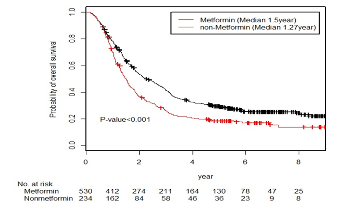 수술을 받은 췌장암 환자 1,919명 중 당뇨병을 동반한 췌장암 환자 764명을 대상으로 분석한 결과, 사망 발생률은 메트포르민을 사용한 경우 72.5%, 사용하지 않은 경우 81.6%였다.