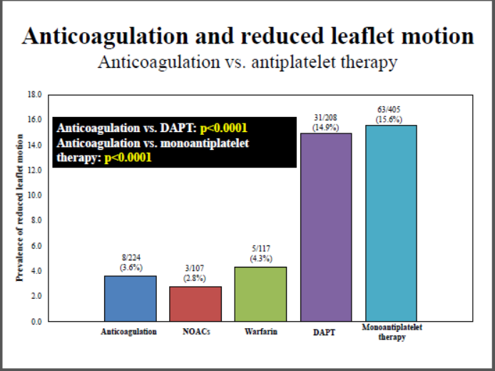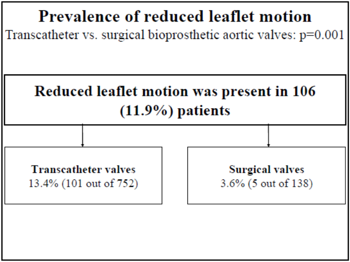 통합 분석 결과, 대동맥 판막치환술을 받은 환자 중 11.9%는 판막엽 주변에 판막의 움직임을 방해(Reduced leaflet motion, (판막 움직임 50% 이상 감소로 정의)하는 무증상 혈전이 발생했다. 치료군별로는 TAVR이 13.4%, SAVR이 3.6%로 두 군간 통계적인 차이도 나타났다(P=0.001).