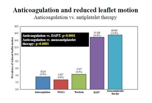 약제별 측면에서 보면, 항응고요법이 단일 항혈소판요법 또는 이중항혈소판요법(DAPT)보다 혈전증이 월등이 낮았다. 항응고요법, 새로운 경구용 항응고제(NOAC), 와파린 투여환자에서의 판막염 운동 감소 발생률은 각각 3.6%, 2.8%, 4.3%로 나타난 반면, DAPT와 단일 항혈소판 요법은 각각 14.9%와 15.6%로 약 5배 가량 높게 발생했다.