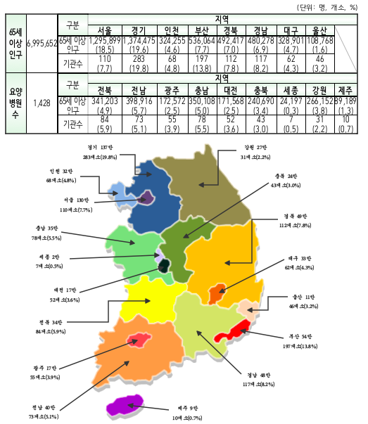 65세 이상 인구는 경상권이 195만명(27.8%), 경기권 170만명(24.3%), 서울 130만명(18.5%) 순이었으며, 요양병원 숫자 또한 노인인구 분포와 유사하게 경상권 534개소(37.4%), 경기권 351개소(24.6%) 등으로 많았다.