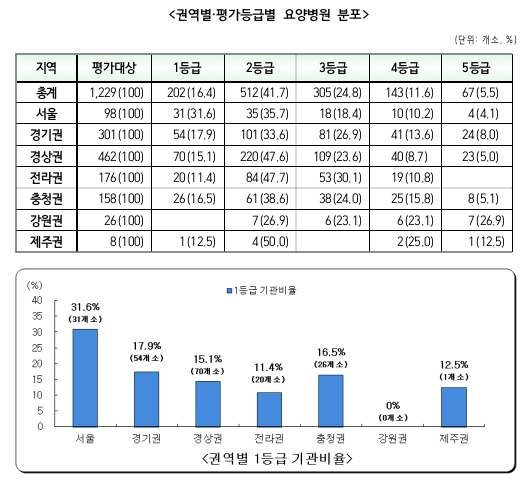 평가대상은 전국 1229개소였으며, 이 중 16.4%에 해당하는 202개 요양병원이 '최고' 등급인 1등급을 받았다. 1등급 의료기관의 분포는 권역별로 경상권이 70개소로 가장 많았고, 개설 요양병원 수 대비 비율로는 서울이 31%로 가장 높았다.