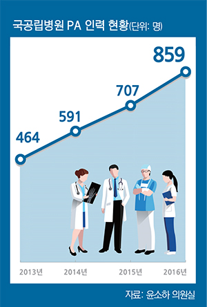 국회 보건복지위원회 윤소하 의원에 따르면 2016년 현재 전국 49개 국공립병원 가운데 25개 병원에서 총 859명의 PA 인력이 고용돼 활동 중인 것으로 집계됐다.