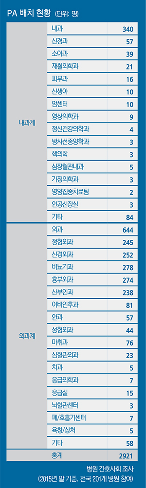 병원간호사회가 전국 201개 병원을 대상으로 진행한 병원간호인력 배치현황 실태조사 결과에 의하면 이들 병원의 PA 숫자는 2015년 현재 2921명으로 조사됐다. 조사에 참여하지 않은 기관들까지 포함하면 그 숫자는 더욱 늘어날 것으로 보인다.