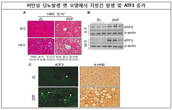 연구팀은 먼저 실험 쥐(ZDF rat)를 통해 인슐린 저항성, 당분해 능력 감소, 지방간 축적과 함께 스트레스 기인 유도 단백질인 ATF3 발현이 크게 증가함을 확인했다.