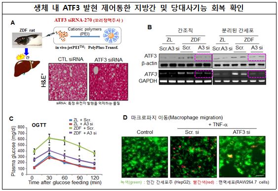 이어 생체 내에서 ATF3 발현을 직접 억제하기 위해 ATF3 특이 siRNA를 제작해 생체 내 전달시스템(delivery system)에 탑재한 주사를 실험 쥐에 주사했고, 그 결과 지방간, 인슐린저항증, 당분해 능력 감소 등이 크게 억제됨을 관찰했다.