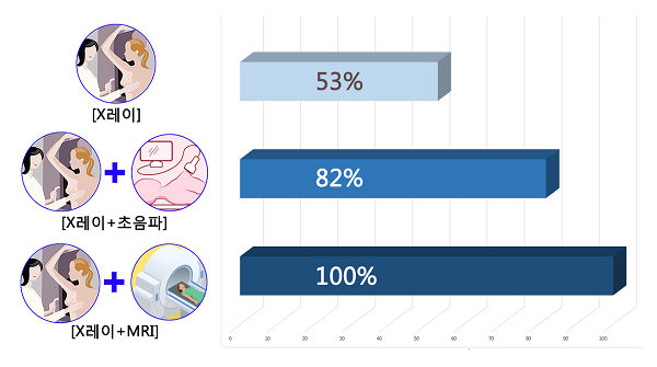 ※ 각 검사의 단일 민감도는 ▲유방촬영 53% ▲유방초음파 65% ▲MRI 88%