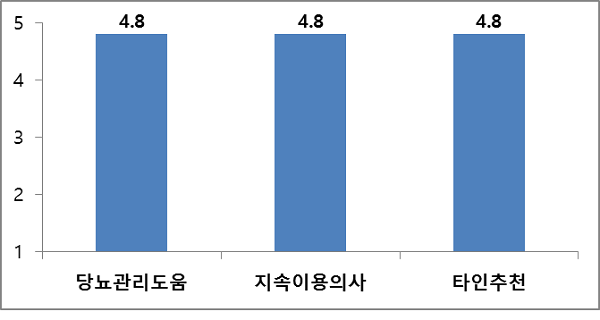 또 참여자 대상 5점 기준 서비스 만족도 조사를 실시한 결과, '당뇨관리에 큰 도움이 됨 4.8점', '본인의 지속적인 사용의사 4.8점', '타환자에게 추천 의사 4.8점'으로 헬스온G 서비스에 대한 참여자들의 높은 만족도를 확인할 수 있었다.