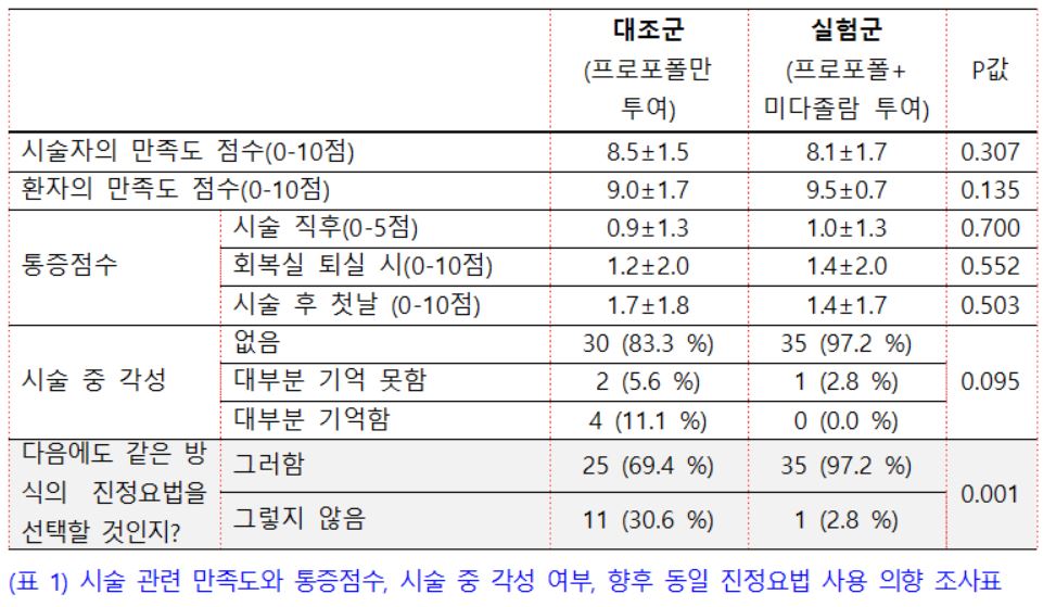 연구팀은 연구대상이 된 총 72명를 무작위로 나눠 한 군에는 프로포폴과 함께 체중 1kg 당 0.02mg의 미다졸람을 추가했고, 대조군에는 프로포폴만 투여한 후 환자들이 느끼는 만족도와 통증을 느낀 정도, 시술 중 각성여부, 추후 반복 시술 여부를 조사했다.