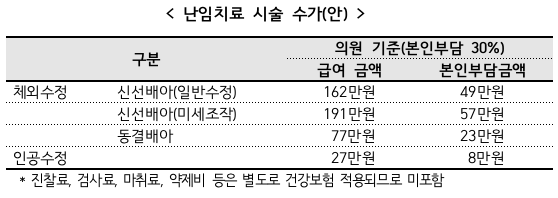 수가 수준은 의원급 의료기관 기준, 체외수정 신선배아 162~191만원, 체외수정 동결배아 77만원, 인공수정은 27만원으로 책정됐다. 환자 본인부담율은 30%다.