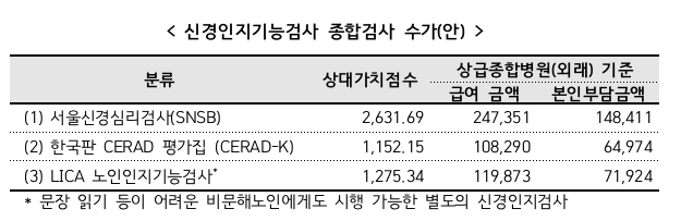 신경인지검사는 만60세 이상의 치매 전단계(경도인지장애), 경증~중등도 치매 환자의 진단 및 경과추적을 위해 시행되는 경우에 급여가 인정되며 수가 수준은 상급종합병원 외래 기준 ▲SNSB는 24만 7351원 ▲CERAD-K는 10만 8290원 ▲LICA는 11만 9873원이다.
