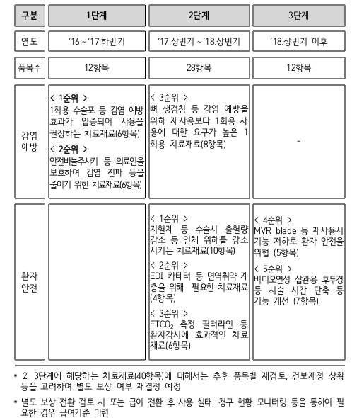 1단계 항목 중 이번 별도보상 대상에서 제외된 ‘안전바늘주사기’ 등 5항목은 2018년 1월부터 별도 보상할 계획이다. 아울러 정부는 뼈 생검침 등 2단계 28항목에 대해서도 9월 중 품목 접수를 시작하고 별도보상 방안을 검토하기로 했다.
