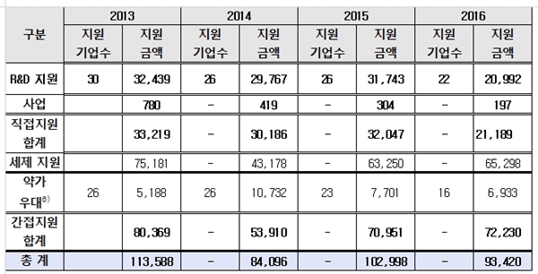 특히 R&D 지원액은 2015년 317억 4000만원에서 2016년 209억 9000만원으로 33.9%(107억 5000만원) 감소했다.