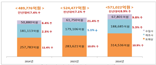 통계집에 따르면, 2016년 전체 의약품 유통금액은 57.1조원으로 전년 52조원 보다 8.9% 증가했다. 2014년 유통금액은 49조원으로 최근 3년간 연평균 7.8% 늘어난 것으로 나타났다.