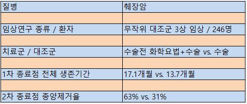 그 결과, 전체 생존기간(중간앖은)은 수술전 화학요법 시행군과 수술군 각각 17.1개월과 13.7개월로 유의한 차이가 나타났다(HR 0.71; P=0.047).