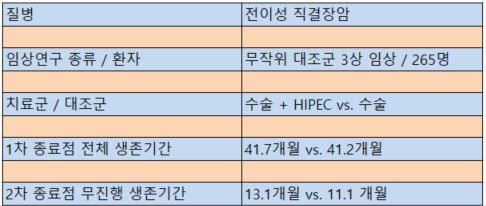 프랑스 몽펠리에 광역암연구소(Regional Cancer Institute) Francois Quenet 박사팀은 265명의 복막암종증을 수반한 4기 대장암 환자(프랑스인)를 수술 및 온열항암요법군(HIPEC군) 또는 단순 수술군(비HIPEC군)으로 나눠 전체 생존기간(OS) 차이를 관찰했다. 추적 관찰 기간은 평균 64개월이었다.