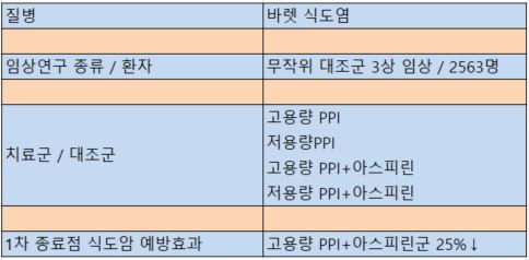 ASPECT는 바렛 식도염 환자 2563명을 고용량(80mg) 에소메프라졸군, 고용량 에소메프라졸+저용량 아스피린 병용군, 저용량(20mg) 에소메프로졸군, 저용량 에소메프로졸+저용량 아스피린 병용군 등 모두 4가지 치료군으로 나눈 후 1차 종료점으로 모든 모든 원인 사망, 식도암 진단 또는 고위험 이형성(암전단계) 진단률을 평가한 연구다. 추적 관찰기간은 8,9년이었다.