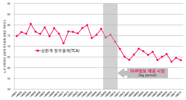 분석 결과에 따르면, 노인주의 DUR정보 제공 후 65세 이상 노인 10만명당 TCA 일평균 처방건수가 76.6건(75.5~77.6건)에서 65.7건(64.5~66.9건)으로 14.2% 감소했으며, 처방 감소 효과는 DUR정보 제공 직후 즉각적으로 나타났다.
