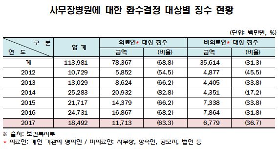 의료인이 납부한 사무장병원 부당이득금 반환액 규모가, 비의료인의 2배에 이르는 것으로 파악됐다.