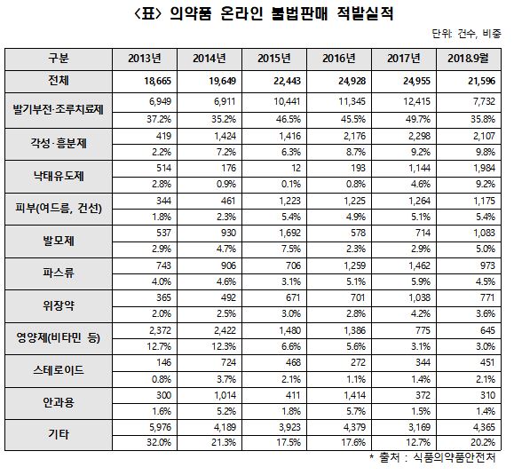 13일 국회 보건복지위원회 남인순 의원(더불어민주당)이 식품의약품안전처로부터 제출받은 자료에 따르면, 의약품 온라인 불법판매 적발건수가 2013년도 1만 8665건에서 2017년도 2만 4955건으로 꾸준히 증가하고 있으며, 올해도 9월까지 2만 1596건에 이른 것으로 나타났다.